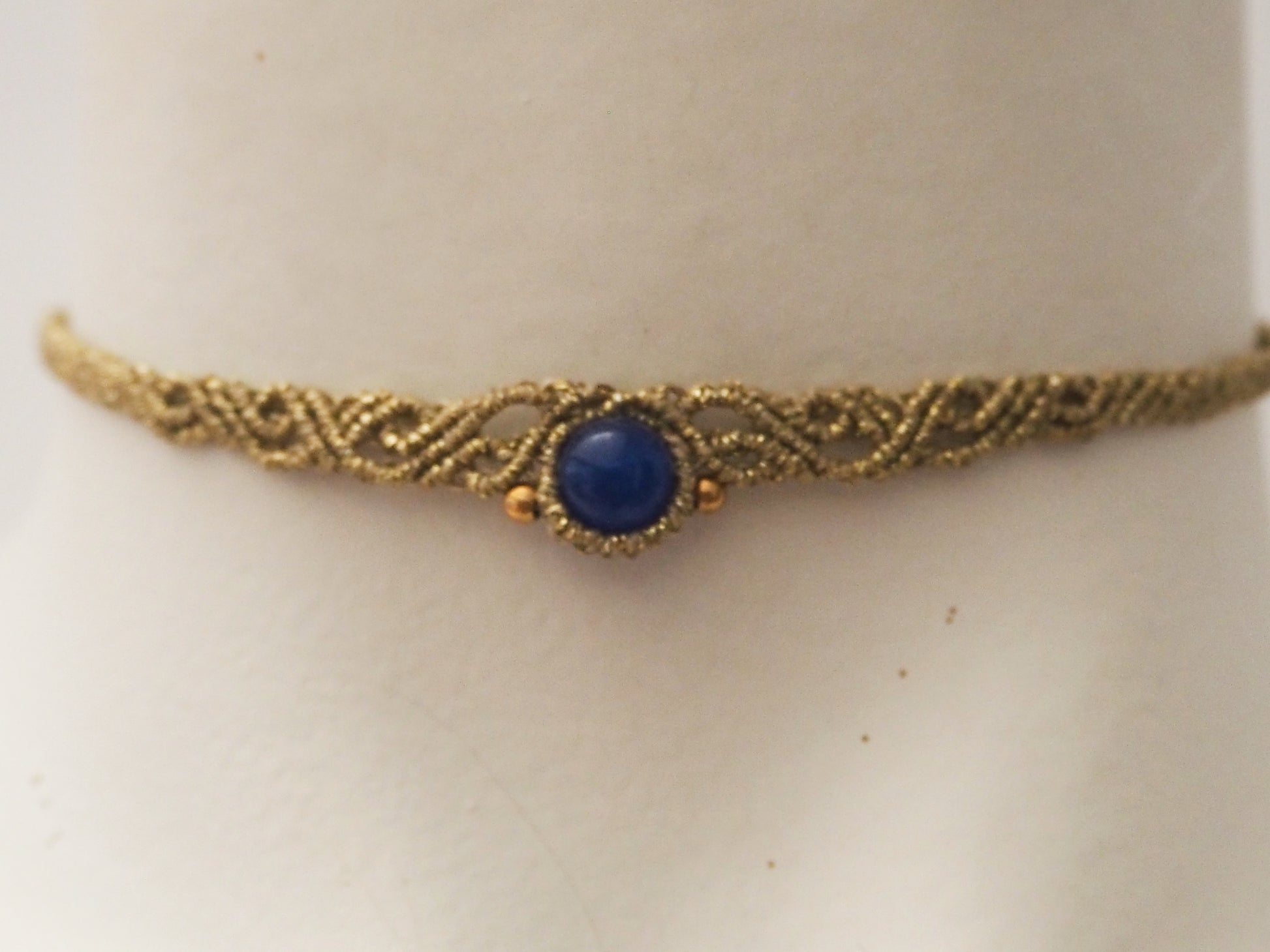 Descubre la elegancia bohemia con nuestro exclusivo choker "Eclipse Dorado". Esta pieza artesanal única fusiona el brillo del hilo encerado dorado con el profundo y místico azul de una ágata natural, creando un accesorio imprescindible para cualquier ocasión.