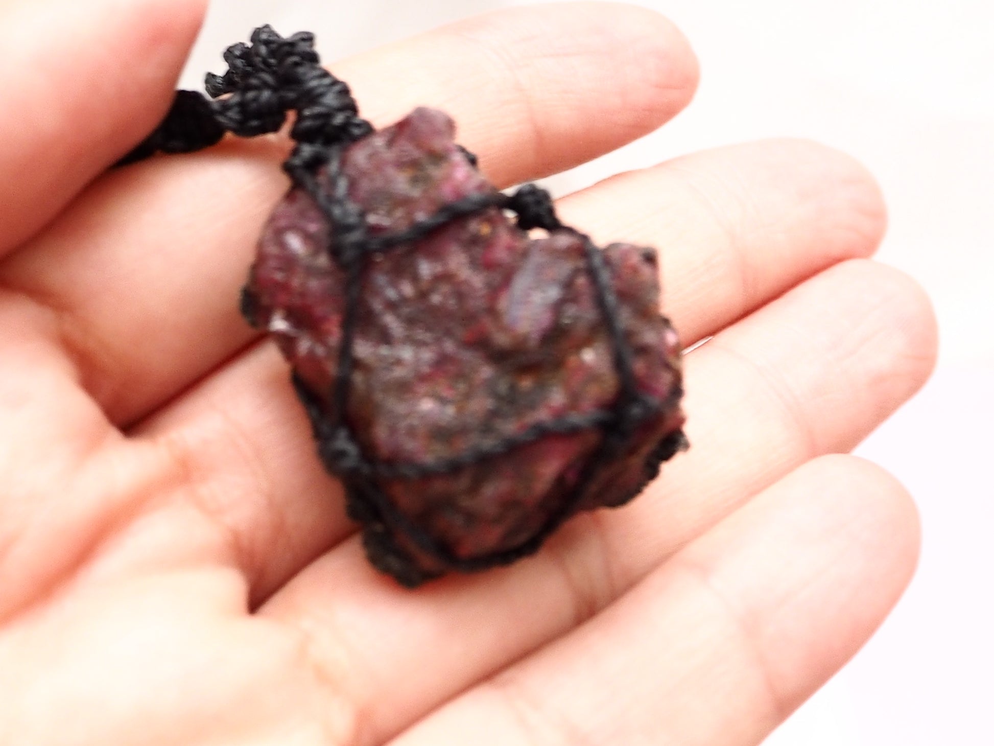 - Diseño Artesanal y Místico: El engarce ha sido cuidadosamente tejido a mano utilizando la técnica del macramé con hilo encerado negro de alta calidad. El diseño es intrincado y seguro, realzando la piedra sin restarle protagonismo.